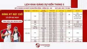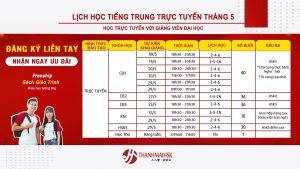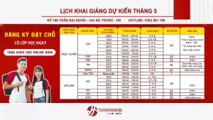 Lịch khai giảng tháng 5 tại THANHMAIHSK. Check lịch các khóa học tiếng Trung tại THANHMAIHSK cơ sở Đống Đa để đăng ký học sớm nhé! Địa chỉ: Số 15 ngách 26 ngõ 18 Nguyên Hồng – Đống Đa – HN Hotline:0931.715.889 (8h30 đến 21h các ngày trong tuần)...