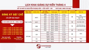 Lịch khai giảng dự kiến tháng 4/2020 các khóa học tiếng Trung tại THANHMAIHSK cơ sở 3 – Hà Đông . Các bạn cùng theo dõi và đăng ký cho mình các lớp học phù hợp nhé! Địa chỉ: Số liền kề 21, ngõ 2, Nguyễn...