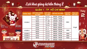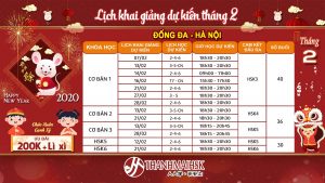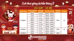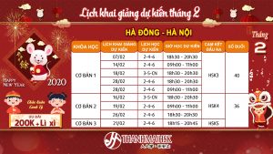 Lịch khai giảng dự kiến tháng 2/2020 các khóa học tiếng Trung tại THANHMAIHSK cơ sở 3 – Hà Đông . Các bạn cùng theo dõi và đăng ký cho mình các lớp học phù hợp nhé Địa chỉ: Số liền kề 21, ngõ 2, Nguyễn...