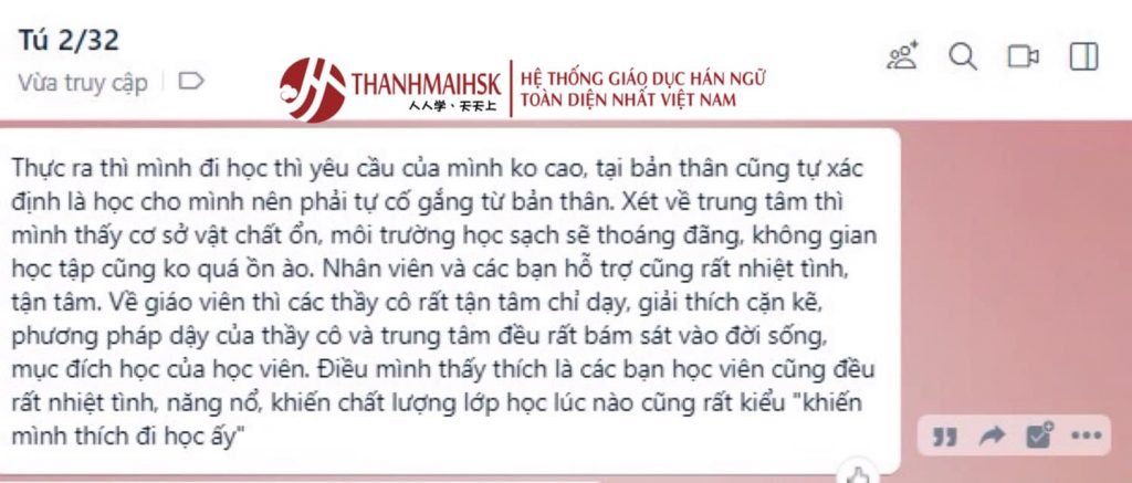 Thanhmaihsk đã có rất nhiều cơ sở toàn quốc. Khóa học đáp ứng như cầu học toàn diện 4 kỹ năng , luyện thi HSK(K), ôn thi Đại học… Hình thức học đa dạng gồm online và offline. Các bạn tỉnh xa hay ở Hải Dương có thể chọn học tiếng Trung trực tuyến để theo học.