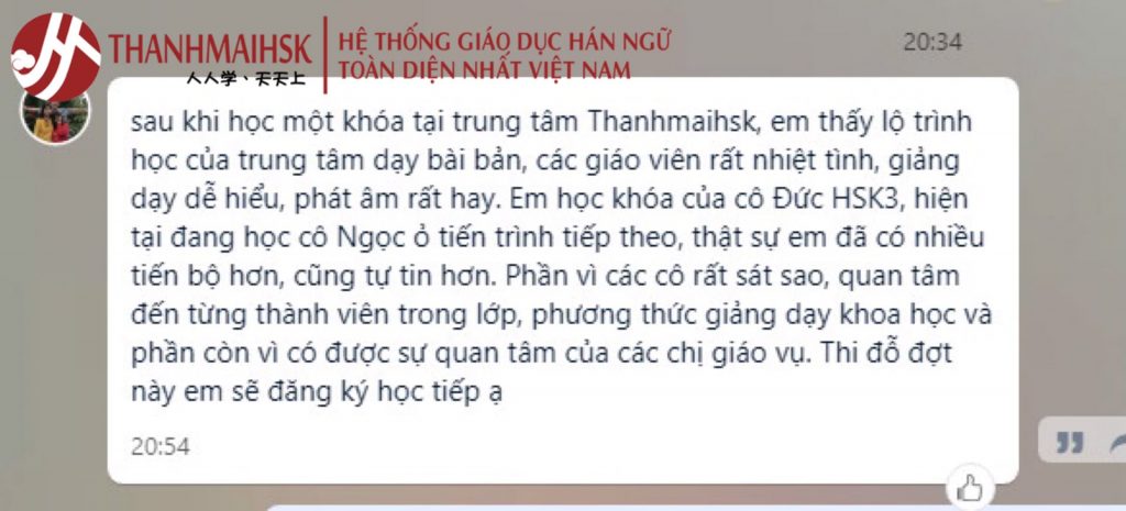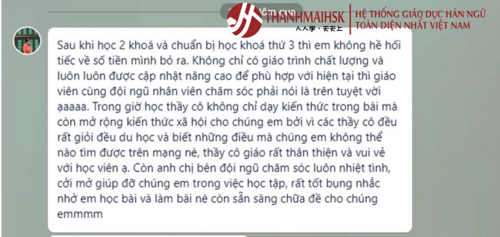 Trung tâm tiếng Trung THANHMAIHSK tự hào là trung tâm có số lượng học viên đông và chất lượng nhất. Giảng viên trình độ trên đại học, giáo trình chuyên biệt, cơ sở vật chất hiện đại và vị trí phủ khắp HN , HCM với 10 cơ sở.